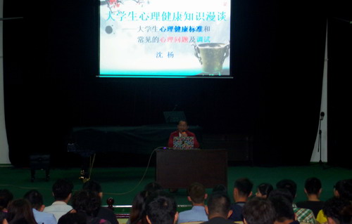 沈科长从“大学生心理健康标准”、“大学生常见的心理问题”、“大学生常见的心理问题的调试”和“值得注意的大学生心理疾病”四个方面进行讲解。他援引清华大学心理学教授樊富珉等专家的看法,归纳了“大学生心理健康的标准”包括七个方面:智力正常、情绪健康、意志健全、行为协调、人际关系适应、反应适度、心理特点符合年龄。“大学生常见的心理问题”有环境适应问题、学业问题、人际关系问题、情感问题、性格与情绪问题、职业发展和择业问题、经济贫困引发的心理问题、不良生活习惯造成的人格缺失八种,沈科长结合具体案例进行一一讲解。针对这些心理问题,如何进行自我调试,他结合自己接诊的案例讲解了九种方法。最后他还介绍了“值得注意的大学生心理疾病”,如焦虑症、强迫症、网络成瘾、神经衰弱、抑郁症、躁狂症、精神分裂症等的症状,希望大家发现某同学有类似症状,及时报告老师,以便早预防、早诊断、早治疗,使每一个同学在大学校园里生活得健康、阳光,并在自己的人生道路上寻求真实的自己,不断突破,努力做一个心态积极、志向远大的青年人。