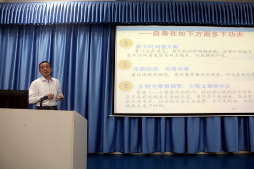 汪教授的报告,主要围绕“对高校科研工作的认识、科研工作的基本范式、科研工作思路来源、提高科研能力的体会”四个方面展开。报告中强调了科研工作对教师发展乃至高校发展的重要性,介绍了科研类型及科研工作流程,并着重提醒大家结题并不是科研项目研究的结束,而应该对研究成果进一步挖掘,例如成果的鉴定、成果奖的申报等。在谈到科研工作思路来源时,汪鑫教授结合自身体会及具体案例,凝炼了四点来源——平时多看文献并注重收集与分析;与同行及非同行人交流,吸纳其有用的观点及方法;从工作和生活中寻找新思路;关注社会热点、焦点问题,关心国家及地区宏观政策,向政策要课题。对如何提高科研能力,他认为科研能力是一个人综合能力的体现,这种能力的提高,既需要学校政策的扶持、氛围的营造,也有赖于个人的执著求索及团队的合作,同时注意处理好教学与科研、行政管理与科研的关系,尤其强调了团队合作的必要性,只有建立科研团队,科研工作才能做大、做强、才能持久发展。最后汪教授勉励在座教师,对于科研工作要有勤于思考的习惯、厚积薄发的潜心修炼准备、严禁的治学态度和学风、规范的学术论文写作、具备“超前意识、问题意识、方向意识、项目意识、团队意识“五种意识、处在一个良好的学术氛围中。