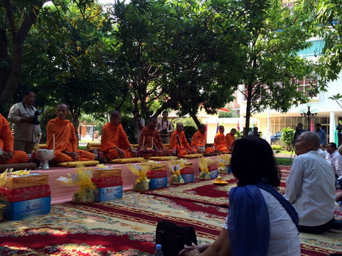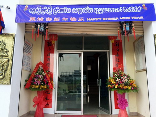 柬埔寨王家研究院孔子学院收到了东南亚电信的祝贺花篮,祝贺孔子学院全体师生柬新年快乐。4月9日,孔子学院亚欧大学中文系的全体汉语教师参加了该校组织的柬埔寨新年体验活动,他们和中文系的学生一起唱歌、跳舞,观看了晚宴上的精彩表演,中文系学生的中文歌曲和武术表演掀起了活动的高潮。帅式毅应邀参加活动,并向亚欧大学董事长董良(Duong Leang)及校长谢索皮(Chea Sopheap)及全体亚欧大学师生祝贺新年。4月10日,帅式毅和张文峰应邀参加了参议院举行的新年活动,9名僧侣诵经祈福,孩子们表演了传统的柬埔寨歌舞。