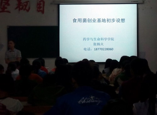4月23日晚,药学与生命科学学院在心远楼608教室进行了食用菌创业的初步设想讲座,本次讲座邀请学院微生物教研室副教授张炳火博士主讲,由学院团委书记徐常龙主持。
