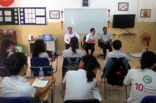 4月30日,谢莫尼勒和帅式毅一起视察暹粒省吴哥高中孔子课堂,共同就孔子课堂的年度工作进行指导,并召开全体公派教师及志愿者的座谈会,吴哥高中校长任诺特(Rin Lot)会见孔子学院院长并列席会议,座谈会由谢莫尼勒主持。谢莫尼勒在了解到公派教师和志愿者教师的生活和教学之中的一些困难之后,和任诺特现场办公解决问题。任诺特还承诺提供校园内两块约1200多平方米的空地给孔子课堂选用建设教学大楼。帅式毅从汉语教学、文化活动和教学科研三个方面对下一阶段的工作进行了指导说明。他指出,教学上,各位教师可以通过“互相听课”的方式来提高大家的教学水平,达到共同学习、一起进步的效果。文化活动方面,应该把中国传统节日庆祝活动与柬埔寨当地文化比较联系起来,以期达到更好地宣传效果。各位教师应该在教学同时,深入研究争取出一批教学成果。会上,各位教师也纷纷发言为孔子课堂的进一步发展献言献策。