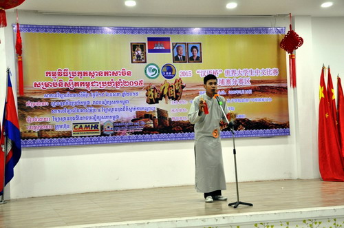 檀勍生参赞在致辞时说,“汉语桥”比赛是中柬两国友谊和文化交流的桥梁,希望参赛选手通过学习中文,更好地了解中国悠久的历史和文化,承担增进中柬两国友谊与合作的重任,为两国人民友好交流作出贡献。当前,中国政府正在大力推动“丝绸之路经济带”和“21世纪海上丝绸之路”。我们简称“一带一路”倡议。民心相通是我们建设“一带一路”的社会基础。而中文则是实现民心相通的重要媒介。我们希望各位老师和同学能积极学习中文,了解中国文化,为推动双方的文化交流做出贡献。中国使馆和孔子学院也将继续为各位学习中文和中国文化,提供各种服务和便利。