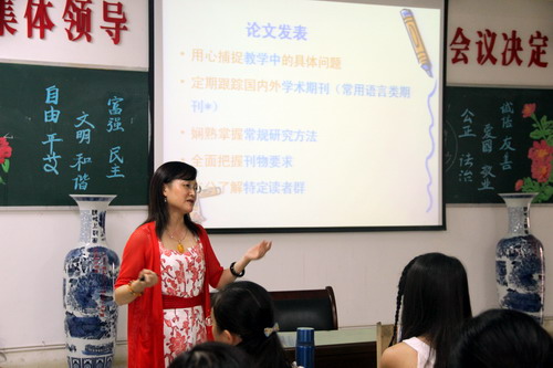 韩琨院长与老师们一起三天始终参加紧张又富有成效的学习,大家受益匪浅都佩服邓教授对教学、科研的执着、坚守、成就,其清晰明了的讲述不时被感激的掌声打断,每天下课后,邓教授总是被好学的老师们团团围住,大家都觉得时间过的太快。在结业典礼上,邓教授指出,通过三天的学习交流了解,外国语学院领导重视教学、科研,身体力行和老师们敬业上进也感染了她,并预祝我院在3-5年内在教学、科研等方面取得长足进展和较大改观。韩琨院长深有感触地说:三天的学术讲座,老师们被邓教授渊博的学术、严谨治学的精神、知识分子的风骨所折服,老师们在邓教授身上感知了一个真正学者的风范与气魄。同时,老师们都从教授、博导的身上学习了许多,获取了力量,对今后的教学、科研有了更足的动力和更明的路径、方向。