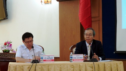 谢莫尼勒介绍了孔子学院发展与留学中国的汉语考试,播放了《十分钟看懂中国》宣传片,视频从人口、宗教、政治、历史、语言文字、经济、教育以及饮食文化等方方面面详细地介绍了当代中国,令与会人员迅速了解中国全貌。其后的柬埔寨王家研究院孔子学院6周年宣传片,从孔子学院的成立历史、取得的丰硕成果以及具体的办学条件和师资力量等方面进行介绍,令人一目了然。