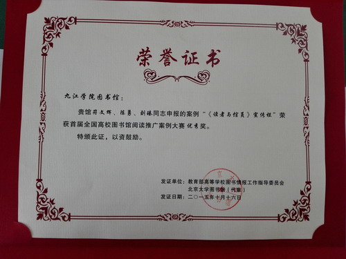 首届全国高校图书馆阅读推广案例大赛于2014年10月启动,今年上半年,全国六个分赛区及港澳台地区组织开展了分赛区的初赛工作,共有456个案例参赛。其中,有38个案例参加决赛,并与118个优秀案例(含单项奖案例)参加决赛现场的海报展示。我馆推送的“《读者与馆员》宣传栏”从华中赛区脱颖而出,荣获大赛优秀奖并参加了决赛现场的海报展示。