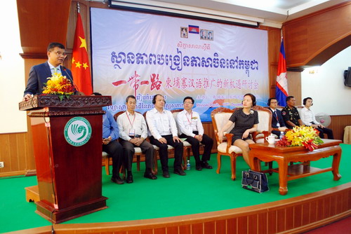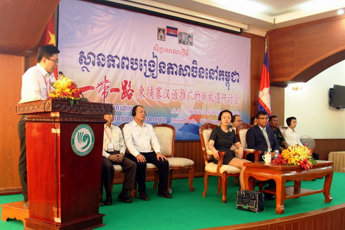 洪尊那隆部长在研讨会上致辞,他指出,中柬两国友好关系的历史由来已久,尤其是万隆会议后,西哈努克国王和中国领导人保持总亲密友好关系;他本人多次陪同洪森总理到访过中国的南北多个省市,尤其是2006年11月1日陪同洪森总理参观曲阜孔庙、孔府、孔林时印象深刻,两千多年前孔子的思想仍有很好的借鉴意义。柬埔寨政府一贯支持中文教育,洪森总理当政后,更是给予了华校大的支持。中资机构在柬埔寨的大量投资给柬埔寨提供了很多就业机会,学好汉语,在以后的就业道路上有着巨大的优势。他感谢中国驻柬大使馆为柬埔寨提供了多的公费留学名额,希望到中国留学的留学生们学好中文、多学知识回国建设国家;感谢孔子学院组织这一次活动,以继续推进柬埔寨的汉语教育。
