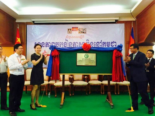 讲话结束后,洪尊那隆部长与韩静女士共同为柬埔寨王家研究院孔子学院茶胶省青年联合会汉语中心揭牌。