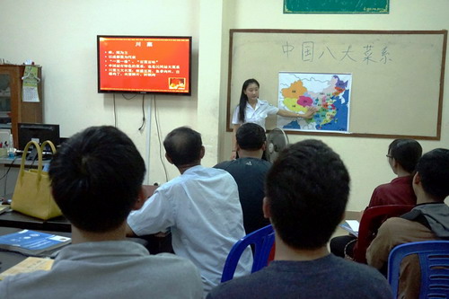 赵小雪老师通过多媒体向各位学员介绍了中国八大菜系分类及各菜系特点。鲁菜糖醋鲤鱼、粤菜太极明虾、川菜宫保鸡丁……一道道中国各地诱人的美味展现在学生面前,学生们应接不暇。期间,赵小雪老师详细介绍了粤菜“烤乳猪”的传说、闽菜“佛跳墙”的来历。在活动中,赵老师还展示了中国形式多样的菜单。活动最后,赵老师播放了家常菜“酸辣土豆丝”制作过程视频。