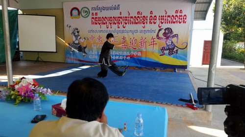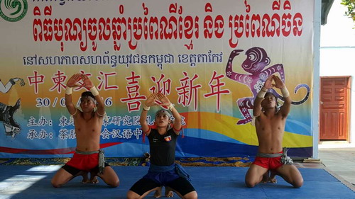 汉语中心学员们合唱的中文歌曲《隐形的翅膀》,拉开了表演活动的序幕;中华太极与达摩剑术的功夫表演点燃全场,柬埔寨传统武术和传统音乐的表演,更深刻地诠释了“中柬交汇”的主题。