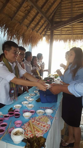 精彩演出节目后是嘉宾参观展览,谢莫尼勒阁下一行在汉语中心学员的簇拥下一起品尝了中华传统美食饺子、汤圆和柬埔寨各式棕子,参观了中华文化墙和照片墙。参观的同时,孔子学院院长谢莫尼勒、中方院长帅式毅也抓住机会现场来宾介绍中国传统文化以及传统春节装饰的文化涵义。