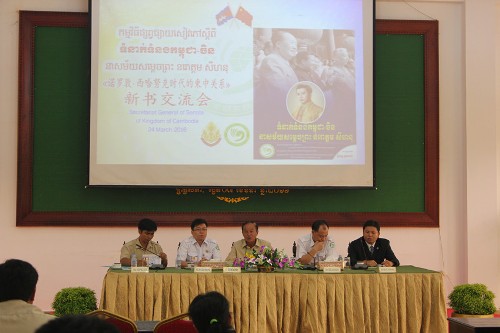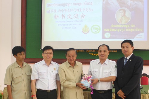 3月24日,柬埔寨王家研究院孔子学院在金边参议院举行《诺罗敦·西哈努克时代的柬中关系》新书推介交流会,并举行孔子学院金边参议院图书室启用议式。柬埔寨参议院秘书局副秘书长隆才阁下(H.E. Loak Chhay),参议院培训办主任诺昆(NOP Kuch),孔子学院院长、参议院顾问谢莫尼勒阁下(H.E. CHEA Munyrith),孔子学院中方院长帅式毅,金边新知书局全彦钢经理,孔子学院参议院官员、青年联合会会员代表、西部大学(Western University)及亚欧大学师生等100余人出席交流会。