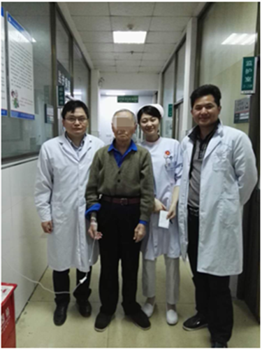 患者胡某某,男性,90岁,家住环城路,3个月前,患者活动后出现左下肢疼痛及麻木症状,站立及步行时明显,负重后症状明显加重,卧床休息症状缓解。推拿、针灸等保守治疗效果不明显,慕名到临床学院/附属医院疼痛科行微创手术。患者由于高龄,还曾因心衰而做过抢救,心脏功能差,随时可能出现心脏骤停情况,手术风险极高。经过认真讨论和深入研究,疼痛科专家决定对患者采取侧卧位,在局麻下实施椎间孔镜下髓核摘除术。手术由疼痛科王礼彬主任主刀,李宜红主治医师、严雄住院医师协助,手术时长1小时。在医护人员的精心照料下,术后第1天患者疼痛及麻木症状得到明显缓解,并且能够独自行走,术后第3天出院。
