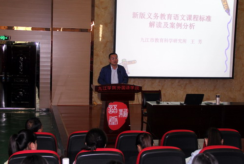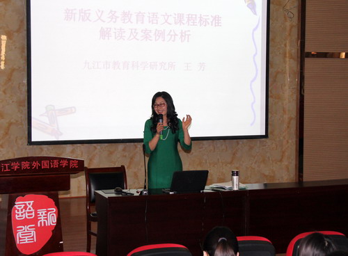 2016年江西省中小学教师资格考试的报名工作已经启动,为使同学们对新版义务教育语文课程标准有整体的掌握,对教师资格考试的面试环节有清晰的了解,同时为进一步加强永利yl23411集团官网承担语文教育专业授课的教师在课程设计方面与义务教育阶段语文教学之间的衔接,4月19日下午,九江市教育科学研究所语文教研员王芳应邀作客由教务处师范教育科和教师发展中心联合主办的九江学院第八期名师论坛活动,做了题为《新版义务教育语文课程标准解读及案例分析》的讲座,来自文传学院的教师代表、13级汉语言文学专业、14级语文教育专业全体学生共计两百余人聆听了讲座,活动由文传学院副院长周子渊主持。