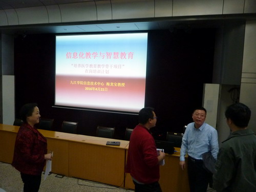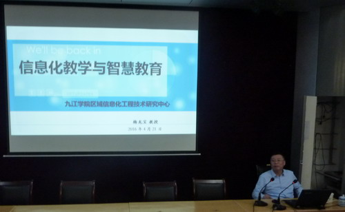 4月21日下午,根据在岗培训计划,学院邀请了九江学院区域信息化工程技术研究中心的梅龙宝教授为全院教师讲授了《信息化教学与智慧教育》。梅教授首先介绍了时下流行的一些信息化教学的方法和手段,如慕课、翻转课堂、可汗大学等,利用实例和图片详细展示了这些教学方法的优越性。随后,根据现代信息化教学前沿热点,为全院教师阐述了今后教育教学的发展趋势——智慧教育,并通过视频短片演示了智慧教育的全过程。