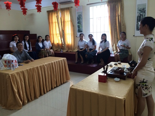 首先,柬埔寨王家研究院孔子学院柬埔寨语言文化培训班班长姚博讲解了茶的起源、中国茶的主要分类及中国的名茶。讲解过程中,姚博一边用通俗易懂的语言中国的名茶,一边用现场事先准备好的茶做示范。