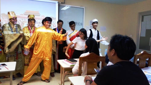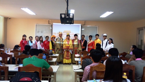 6月4日上午,柬埔寨王家研究院孔子学院金边国际大学汉语中心新增汉语班第二次举办中国文化体验活动,本次文化活动体验内容是中国服饰。有皇帝装,男女汉服,少数民族服装,如壮族、蒙古族、傣族、回族等,还有太极服,茶戏服等。参加本次活动的有金边国际大学汉语中心新学员69人。