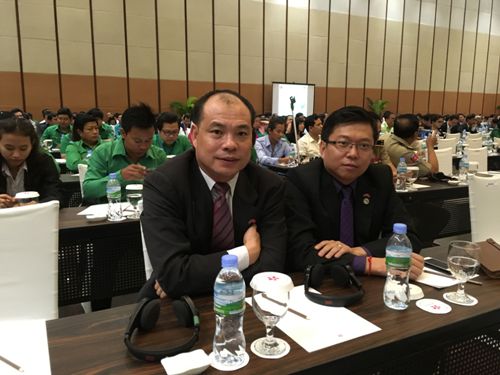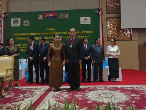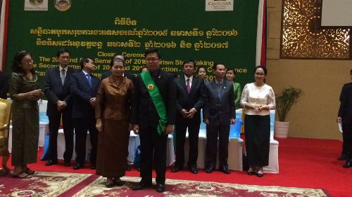 7月13-14日,柬埔寨旅游部年度工作会议在柬埔寨索卡酒店召开,副总理棉森婉(MEN Sam An)出席会议闭幕式,并为柬埔寨王家研究院孔子学院院长谢莫尼勒阁下(H.E. CHEA Munyrith)颁发绿色金质奖章,以表彰他多年为推动柬埔寨绿色旅游所做的工作,为中方院长帅式毅颁发柬埔寨王国国王签发的最高友谊勋章,以感谢他为促进中柬人文交流,尤其是推动柬埔寨China Ready白皮书项目所做的辛勤工作。