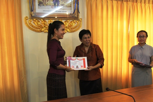 最后,彭萨格娜阁下为顺利完成学习的首届文化与艺术部官员汉语班学员颁发结业证书,授予谢莫尼勒阁下和帅式毅院长勋单并颁发证书。
