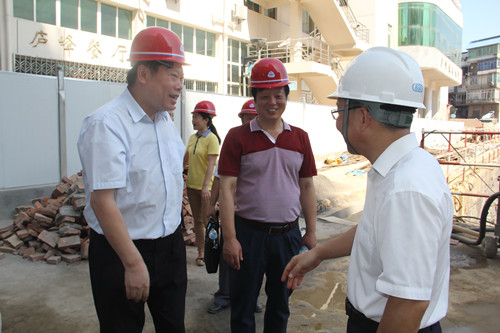 刘少华一行顶着烈日走进建设工地,实地考察工程实施情况。刘主任详细询问了新门诊综合大楼建设项目工程进度、施工质量、安全保障等情况,他对目前的工程建设情况给予了肯定。刘主任指出,一是要确保安全,强化安全意识,确保施工安全;二是要保证质量,加强管理,保质保量完成建设项目;三是要加快进度,抓紧“黄金”施工期,按时间节点完成建设任务。