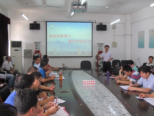 随后,宋处长首先对九江学院大学科技园的现状进行了介绍,对创新、创业的内涵进行了解释并对科技园现在相关的优惠政策进行了详细的解读,并从战略部署、政策导向、活动催化、发展急需、成效初显等方面对学校大学科技园的发展规划进行着重介绍。会上,宋处长鼓励学院教职工积极响应国家“大众创业、万众创新”的号召,加强科研成果的转化力度,积极入园,将成果转化成产品。