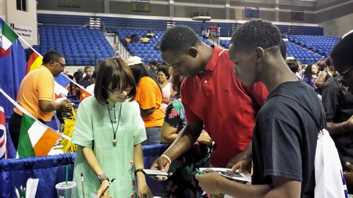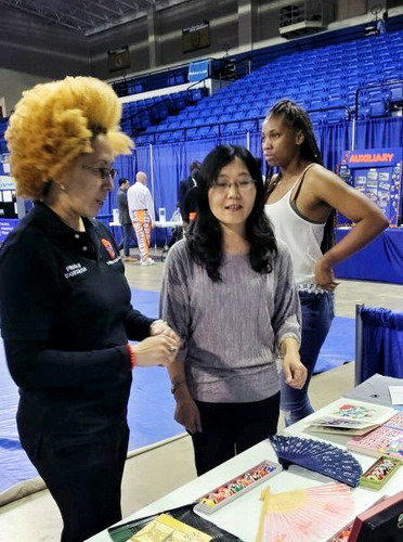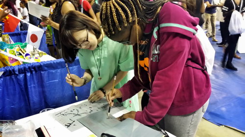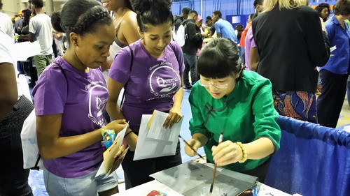 在30多个院系和部门中,萨凡纳州立大学孔子学院以独具中国特色的展台与形象吸引了众多师生和家长前来观看、咨询。在中方院长的带领下,孔子学院的汉语教师精心组织,生动形象地向美国师生、家长们展示了极具中国传统文化魅力的各项活动。大家不仅兴致勃勃地体验如何用毛笔写中国字,探讨中国京剧脸谱和剪纸技艺,尤其对孔子学院安排的汉语课程以及丰富多彩的文化活动产生了浓厚的兴趣与关注。老师们派发给来访者的印有中国各地风景的明信片更是深受欢迎。