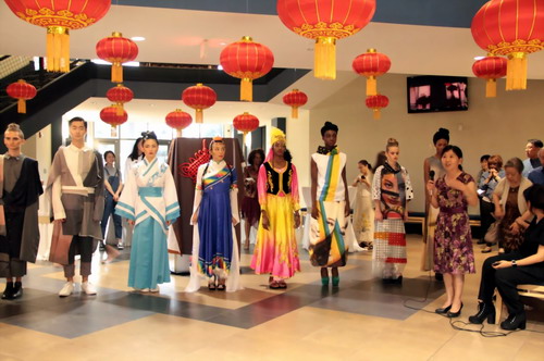 接下来,伴随着优美动听的音乐,身着中国民族服饰的美国学生模特们缓缓走来,中方院长向来宾们逐一介绍了独具中国特色的各类服饰。从含蓄典雅的汉服到长袖宽腰的藏服,从大方美观的旗袍到多彩绚丽的维族服装,每一套服饰都如同一张文化名片,蕴涵着中华传统文化悠久的历史,更彰显出世界文化交融的多样性。