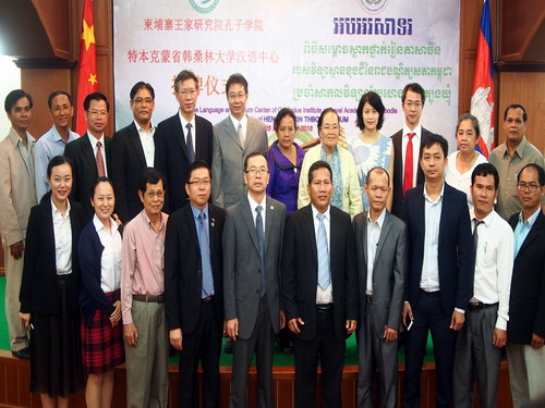 10月25日下午,柬埔寨王家研究院孔子学院特本克蒙省韩桑林大学汉语中心揭牌仪式在柬埔寨王家研究院孔子学院举行。柬埔寨王家研究院院长、孔子学院理事长克洛媞达院士(Academician KHLOT Thyda)、江西人民出版社社长张德意、韩桑林大学校长品万那罗(H.E. PIN Vannaro)、孔子学院院长谢莫尼勒阁下(H.E.CHEA Munyrith)、中方院长夏修龙教授等出席揭牌仪式。揭牌仪式由谢莫尼勒院长主持。