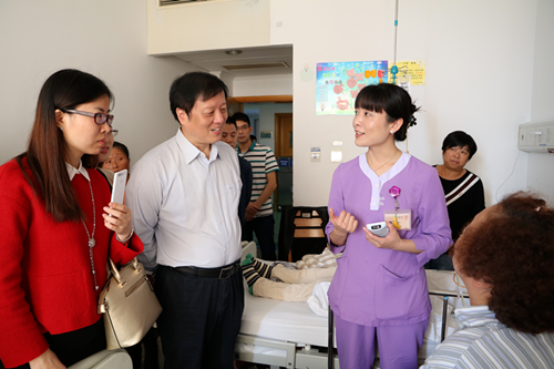 10月24日上午,在华山医院,该院信息科科长黄虹热情接待了张志平院长一行,详细介绍了华山医院信息化建设、科室管理、无线网络及移动医疗应用经验。在黄科长的陪同下,张院长一行参观了华山医院信息科、门诊、神经内科住院病区。在神经内科护士站,该院许雅芳护士长热情介绍了移动医疗应用场景,交流了护理管理经验,其专业的技术能力、良好的职业素养、有效的沟通技巧给临床医学院/附属医院考察人员留下了深刻的印象。