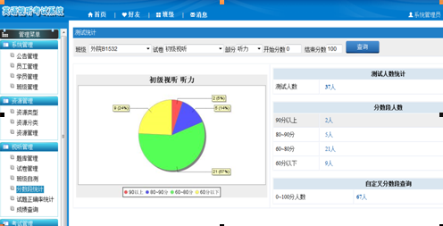 “英语视听考试系统”考试界面布局合理,视听管理模块可自设题目难度等级,根据题目难度设置分值、考试时间,添加各种题型,对于填空和翻译,系统可识别多个正确答案,系统完全自动评分,考试结束立即给出考生得分和统计结果。