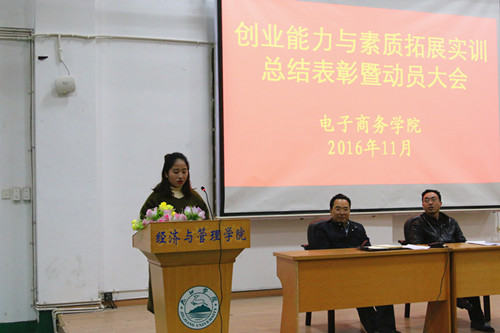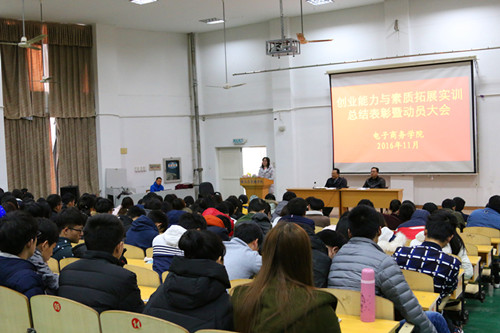 为提高大学生的创业能力和综合素质,推进在校生实训工作顺利开展,电子商务学院于11月23日下午文友楼三楼报告厅召开创业能力与素质拓展实训总结表彰暨动员大会。电子商务学院院长郑祚双、副院长郑孝庭出席会议。实习指导教师、学生辅导员、实验室工作人员、2014级和2015级实训学生及上一期优秀实习生参加会议。会议由实验室主任陈显章主持。