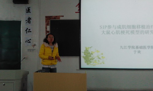 报告会上,张义平博士做了题为《雌激素ß调控甘草素的中药材真菌转化和防治肝恶性变的分子机制研究》、于欢博士做了题为《S1P参与成肌细胞移植治疗大鼠心肌梗死模型的研究》的学术报告。两位老师对课题的研究思路、研究内容和科研成果进行介绍。通过本次学术活动不仅促进了基础医学院师生之间的学术交流,浓郁了我院的学术氛围,开阔了研究视野,对各学术团队之间的交流与合作发挥了积极的促进作用。