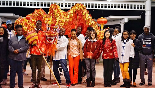 春节舞龙表演合影