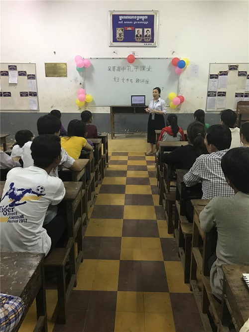 3月7日下午,值第106届国际妇女节来临之际,柬埔寨王家研究院孔子学院暹粒省吴哥高中孔子课堂举办了以“美丽心灵,魅力汉语”为主题的妇女节专题讲座活动。吴哥高中孔子课堂师生50余人参加了此次活动。