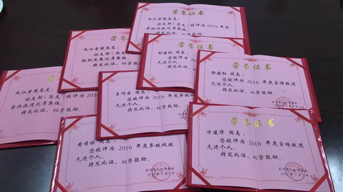 九江学院总支因工作突出、成绩显著,同时获得了“2016年度参政议政优秀集体”、“2016年度宣传报道优秀集体”、“2016年度组织发展优秀集体”三项荣誉。这也是农工党九江市十三个基层组织中唯一一个同时囊括三项荣誉的基层单位。