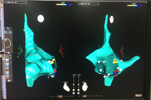 以前常规的射频消融手术都是在X射线下进行的,医生和患者不仅要长时间暴露在X射线的照射下,带来健康隐患,而且存在消融靶点定位准确性不高,有一定复发的可能性。CARTO系统特别是CARTO3是近年来心律失常治疗领域的革命性技术,专门用于治疗房颤、室上速、室速和室性早搏等心律失常。该系统能将患者心脏的三维立体解剖图像和电传导信息准确清晰地显示在电脑屏幕上,指导操作医生快速准确地找到靶点,将其消融消灭,不仅提高了手术成功率,也显著降低了并发症发生的危险性以及心律失常的复发。