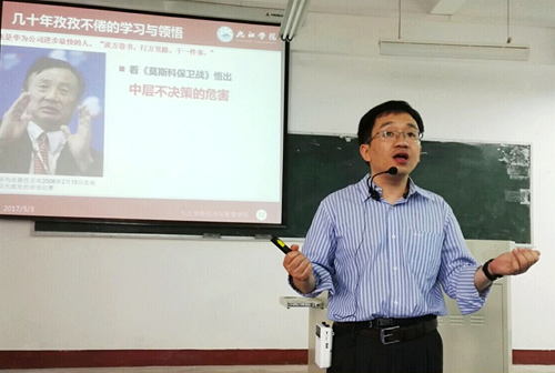 报告中,秦峰主任首先提出问题:华为是谁?华为为世界带来了什么?华为在坚持着什么?接着,他详细介绍了华为30年的发展历史、华为的创始人及领导人——任正非以及华为的人力资源管理实践。最后,秦峰主任对本次讲座进行了总结:华为的标杆意义在于,探索出一条在中国发展与管理高科技企业的道路。秦峰主任渊博的专业知识和深入浅出的讲解博得全场师生的阵阵掌声,同学们纷纷表示今晚的讲座让他们受益良多。