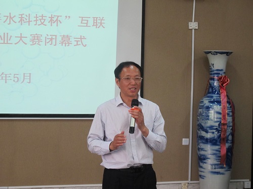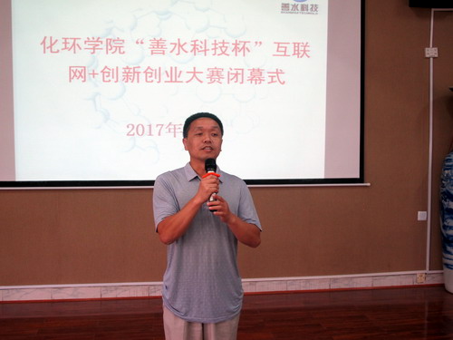 闭幕式上,孙德四副院长宣读获奖名单,竞赛赞助单位善水科技有限公司人事部部长李代明对大赛进行点评。化环学院党委书记刘新强对九位校内外专家评委和所有关心支持本次大赛的老师、同学们表示了衷心感谢,并对本次大赛进行了总结。他指出,此次比赛,班级参赛率超过95%,几乎达到了每个班级都至少提交了一件参赛作品,充分展示了化环学院浓郁的创新创业氛围以及化环学子创新创业的热情。在作品数量增加的同时学生竞赛项目的质量更是明显提升,竞赛项目涉及行业范围更加广泛,既有与本专业学科相关的“温敏水凝胶缓释制剂载体”、“新型保鲜材料”等,也有与生活息息相关的“全名菜园APP”、“汽车后服务平台”等,更有“全南县南迳镇健康特色小镇建设项目”等将互联网思维引入更深层次的项目,充分表明学生对“互联网+”的理解、对互联网与传统产业的结合有了新的、更深刻的认识。他希望学生利用这次机会、这个平台,培养自己的创新创业精神和互联网思维,将自己的奇思妙想能够变成真正的生产力和市场价值,为将中国从“中国制造”转变为“中国智造”贡献出自己的力量。