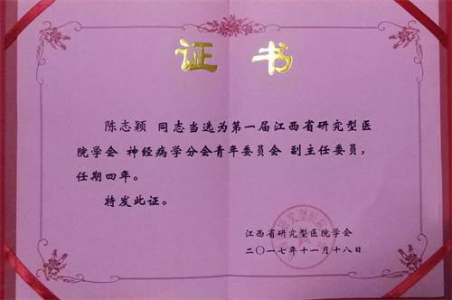 临床医学院/附属医院神经内科陈志颖当选为第一届江西省研究型医院学会神经病学分会青年委员会副主任委员
