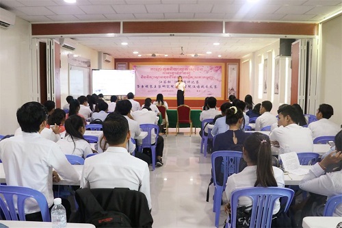 12月2日,第七届“江苏杯”汉语演讲比赛暨柬埔寨王家研究院孔子学院汉语风采大赛预赛在柬埔寨孔子学院三楼多功能厅顺利举行。来自柬埔寨全国各地18-25岁的大学生或社会人士积极报名参与,共计78名选手参加了此次比赛。柬埔寨王家研究院孔子学院柬方院长苏碧娜女士(VUTH Sopheakna)出席并讲话,本次比赛由柬埔寨孔子学院亚欧大学中文系公派教师乐雷汉、黄青山、陈惠玲、戴嘉维,孔子学院本部志愿者教师黄书、刘彧昭、马家琪担任评委。现场有选手及其亲友团约150余人,场面热闹。