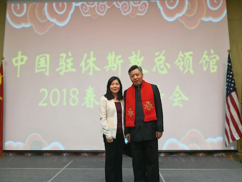 当地时间2月7日,萨凡纳州立大学孔子学院中方院长罗其娟应邀参加了中国驻休斯顿总领事李强民大使及夫人曾红燕在总领馆举行的2018年春节招待会,与美南华人华侨、中资机构、留学生及友好人士代表400多人一起共迎新春。总领馆刘红梅副总领事主持招待会。