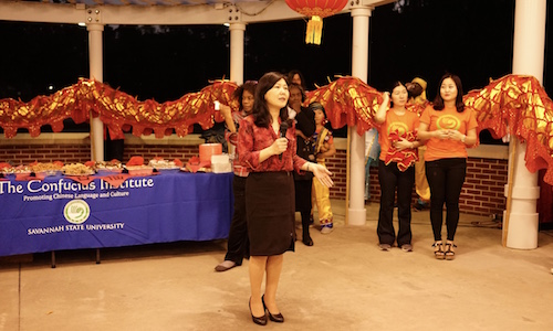 美国当地时间2月16日晚,随着夜幕的降临,在美国萨凡纳州立大学校园内,由美国萨凡纳州立大学孔子学院主办的“2018农历狗年迎春接福”春节庆祝活动正式拉开帷幕。萨凡纳州立大学副校长、国际交流处处长伊曼纽尔·纳纽泽(Emmanuel Naniuzeyi)、萨凡纳州立大学教育广播电台台长格蕾斯·卡瑞(Grace Curry)、萨凡纳查特姆县优秀华人代表以及萨凡纳州立大学师生和周边社区民众共100多人欢聚一堂,共同庆祝2018中国春节。