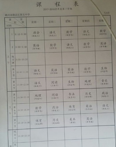 车达赣州后,各地学校都早早地派来了老师来迎接我们。下车后,我们先在少年宫开了一个短会,之后拿着行李跟随着各中学老师去之前分配好的学校。汽车开了二十多分钟之后,我所支教的学校就出现在了我眼前——赣县茅店中学。一进学校,就看见有几位老师在等我们,要上前帮忙拿行李。有了她们的帮忙,我们很快来到住所,整理好东西,跟着她们一起去了食堂吃饭。接着就是开例会,介绍接下来的工作并且给我们分配指导老师。我的指导老师是一位经验丰富的高级教师,在后面的教学中,她给了我很多指导与帮助。会议结束后,我们三个都拿到了自己的课表和课本,但第二天就要上课。因为事实上我们晚来了三个星期。听到这个消息,我们都是一副惊恐的表情,还没准备好就要开始上课。晚上,我大致了解了一下班上的情况,熟悉了所教的课本,然后和指导老师交流了一下,最后决定慢慢来,不急着赶进度。但我内心也知道,前面的内容要重新学习,要尽量赶上其他班的进度。
