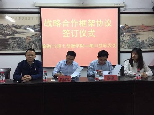 为积极推动校地战略合作,加强高校与地方的联系与交流,落实九江学院与湖口县人民政府签订的战略合作框架协议,4月20日上午,旅游与国土资源学院与湖口县旅游发展委员会在竞知楼512会议室举行合作协议签订仪式。湖口县旅游发展委员会主任吴林东、旅游与国土资源学院院长李松志、党委书记黄伟参加了签字仪式。