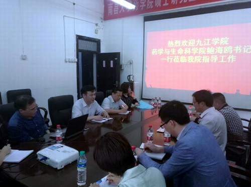 南昌大学药学院党委书记黄希红、副院长夏春华、副院长李炜等热情接待鲍书记一行,并介绍药学院的状况、发展定位、办学目标、一流学科、重点实验室建设等,分享了南昌大学药学院在审核评估中的具体做法和成功体会。双方就学科发展、特色专业、优秀人才引进、教学制度建设、课程建设等进行了广泛交流。