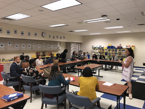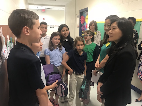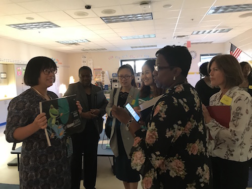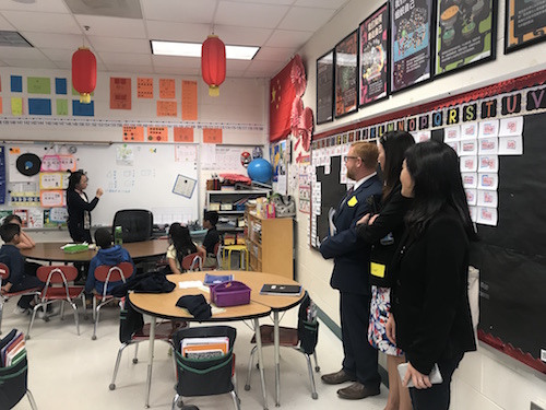 当地时间4月30日,美国萨凡纳州立大学孔子学院中方院长罗其娟带领两位汉语教师与即将于2018年秋季学期开展双语沉浸式教学项目的试点学校萨凡纳市哈文小学校长迪翁扬(Dionne Young)、萨市公立学校系统小学部教学负责人瓦勒莉·凯福(Vallerie Cave)、萨市公立学校系统世界语专家马克·林斯基(Mark Linsky)一同前往南卡罗莱纳州希尔顿首脑小学,走进中英双语沉浸式项目的课堂参观学习。