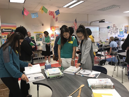 随后,希尔顿首脑小学英才教育项目负责人珀杜·凯伦(Perdue, Karen)带领大家走进了该小学1-5年级的双语沉浸课堂,参观教室的设计、布置,浏览教材及教辅资料,并对不同科目的中文沉浸式教学进行了观课。