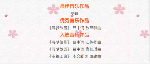 在截止日期前,共收到歌词35篇、曲谱45篇、音乐小样41个。随后筛选出10首歌曲进行网络投票,并于2018年4月16日组织召开专家评审会进行了综合评审。最终根据专家评审意见和网络投票情况评出1首优秀音乐作品和3首入选音乐作品,最佳音乐作品空缺。