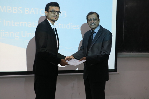 巴基斯坦籍教师Dr.Ashfaq 祝贺2013级学生完成医学理论阶段学习,感谢九江学院和国际交流学院老师对学生们的帮助,他表示,来中国学习医学是正确的选择,不会落后于世界上任何一个国家,希望大家终身学习。