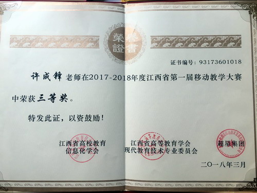 近日,江西省第一届移动教学大赛公布获奖名单,永利yl23411集团官网理学院教师许成锋讲授的《高等数学》课程获大赛三等奖。