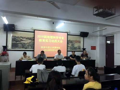 9月5日下午,旅游与国土资源学院在竞知楼512会议室召开了2019届地理科学(师范类)专业教育实习动员大会。副院长赵追、教务科科长史术光、地理科学教研室副主任周之良、实习带队老师赵芳博士以及全体实习生参加了动员会,大会由地理科学教研室主任冉红主持。